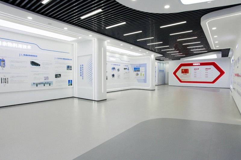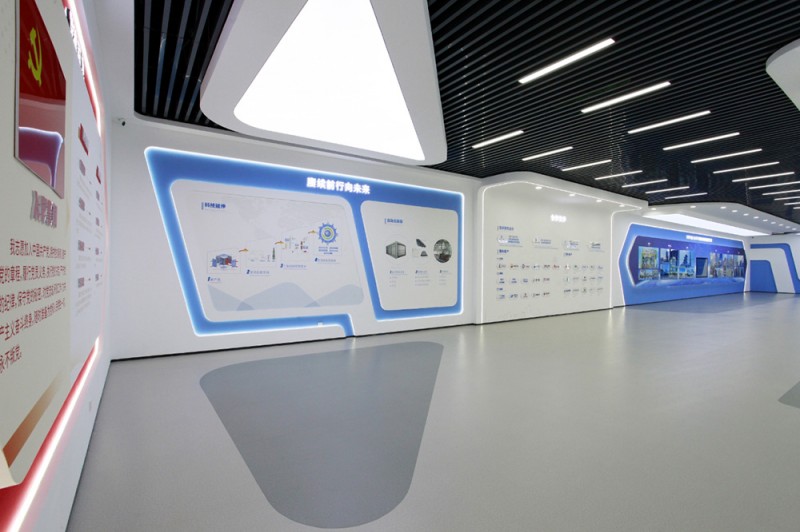 頂和地面造型統(tǒng)一,白色吊頂和灰色橡膠地面,黑色方鋼吊頂和灰色橡膠地面相互呼應(yīng),統(tǒng)一中富有變化,變化中又蘊(yùn)含統(tǒng)一,使整個(gè)展廳科技意境深遠(yuǎn)悠長。