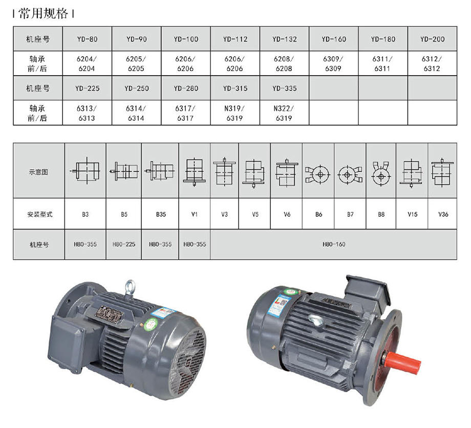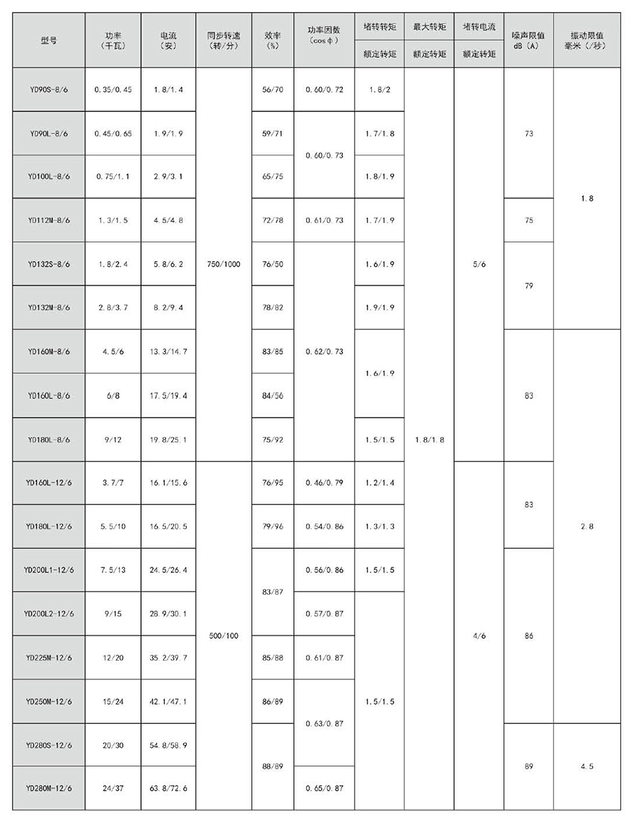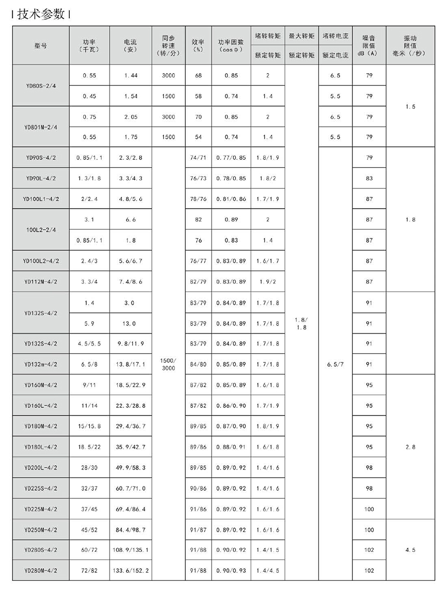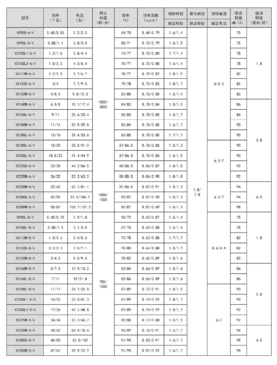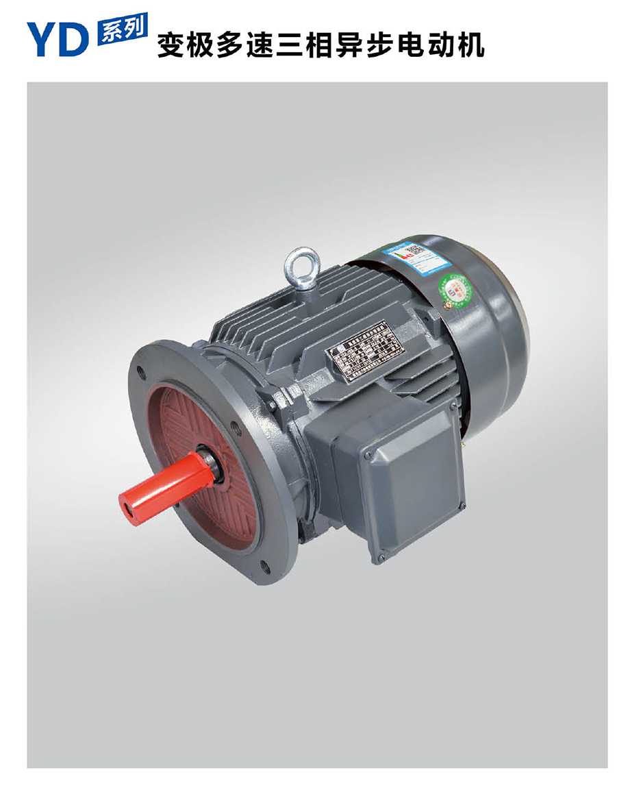 YD系列變極多速三相異步電動機是Y2系列三相異步電動機的電氣派生產(chǎn)品,本系列的外形及安裝尺寸、絕緣等級、冷卻方式均與YE2系列相同,安裝尺寸完全符合國際IEC標準,功率等級、起動性能與力能指標均與國際同類變極多速電動機的先進水平相近。
