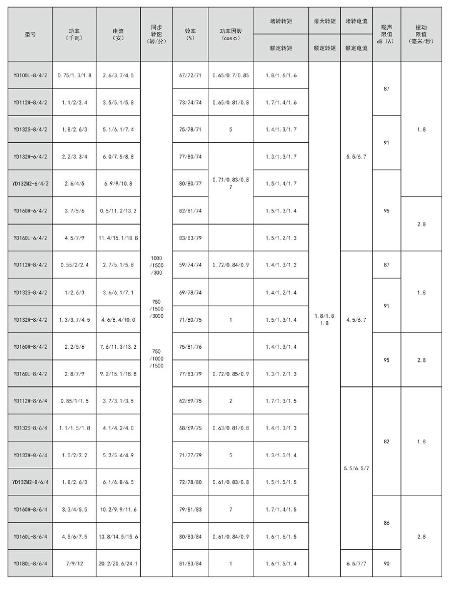 YD系列變極多速三相異步電動機可以與手動控制、接觸器、控制器械等一起進行速度控制,節(jié)約大量電能。采用改變繞組的接法來變換電機的轉(zhuǎn)速和輸出功率,使期與機械設備的負載特性相匹配,簡化了變速系統(tǒng),高效,節(jié)能。本系列電機轉(zhuǎn)速有雙速、三速和四速三種,極數(shù)比有412、6/4、8/4、12/6、6/4/2、8/4/2和8/6/4、12/8/6/4等九種,其主要性能指標和國外同類產(chǎn)品的先進水平相當,較老系列有較大提高。